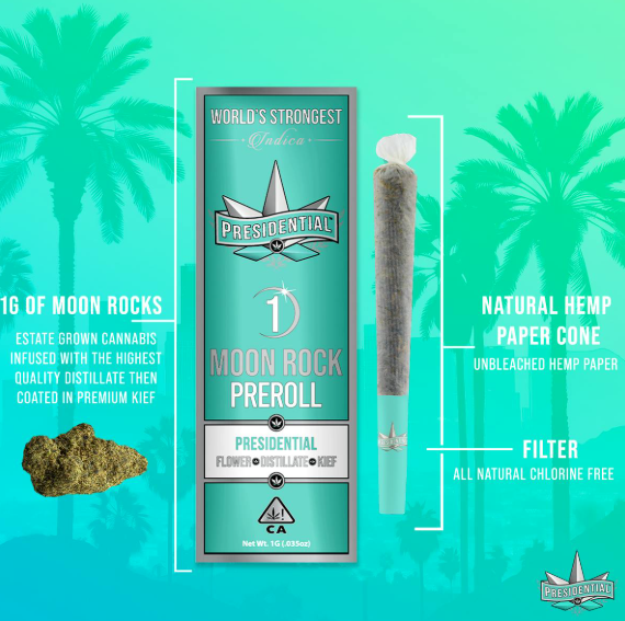Your Presidential Moon Rocks consists of estate grown cannabis INFUSED with the highest quality distillate and coated in premium kief. Our innovative proprietary infusion process enables us to permeate the flower to the stem. This creates the slowest burning, most potent Moon Rocks on the market.