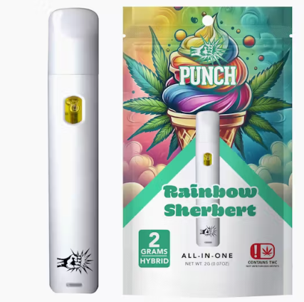 Rainbow Sherbert 2g Distillate AIO Vape is sweet and fruity delivering a burst of flavors reminiscent of your favorite ice cream. Indulge in the sweet and tangy combination of raspberry, lime, and orange. Made with high-quality distillate and natural derived terpenes, this vape delivers a smooth and flavorful experience. Perfect for any time of day.
