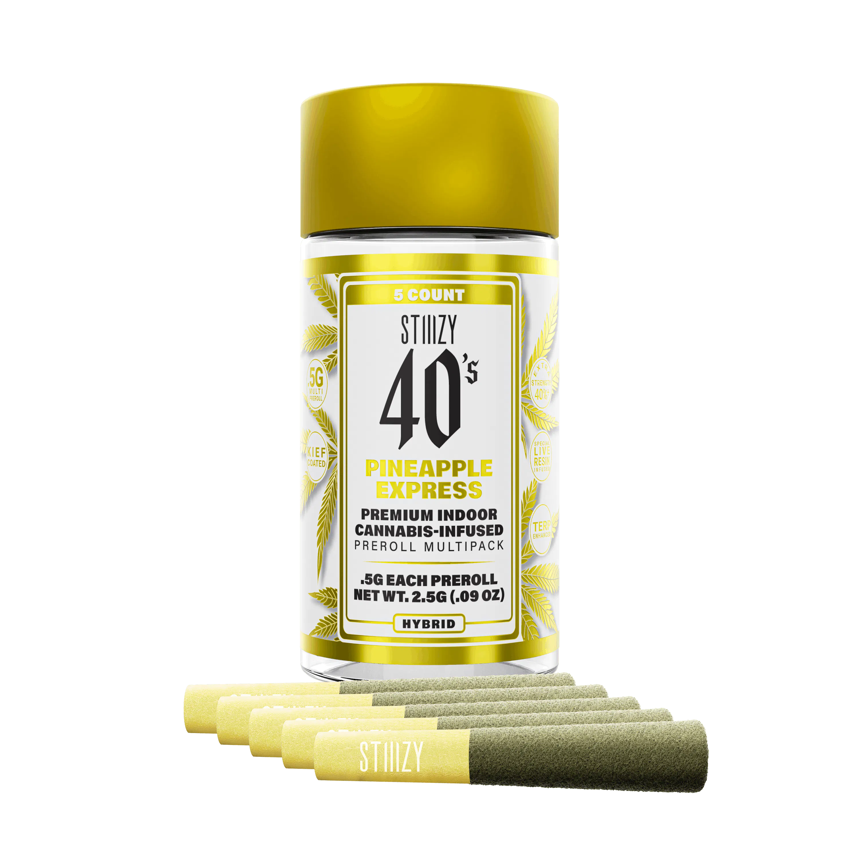 Elevate your pre-roll game. Stiiizy 40s pre-rolls are setting the standard with high potency, cannabis infused joints coated evenly with kief. Using our proprietary live resin infusion methods, we’ve designed every pre-roll to offer 40%+ THC potency with a unique flavor profile. With a smooth inhale and tasteful exhale, each and every Stiiizy 40 is packed with indoor grown flower, specifically made to ensure a potent and long-lasting high. Spark up the 40s.